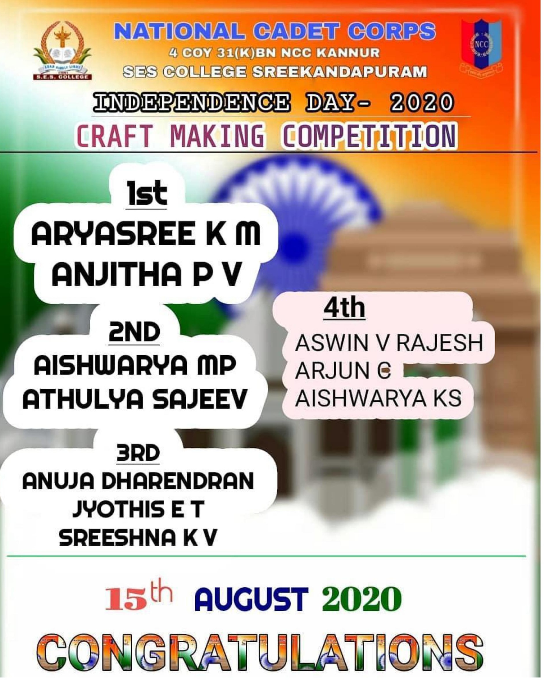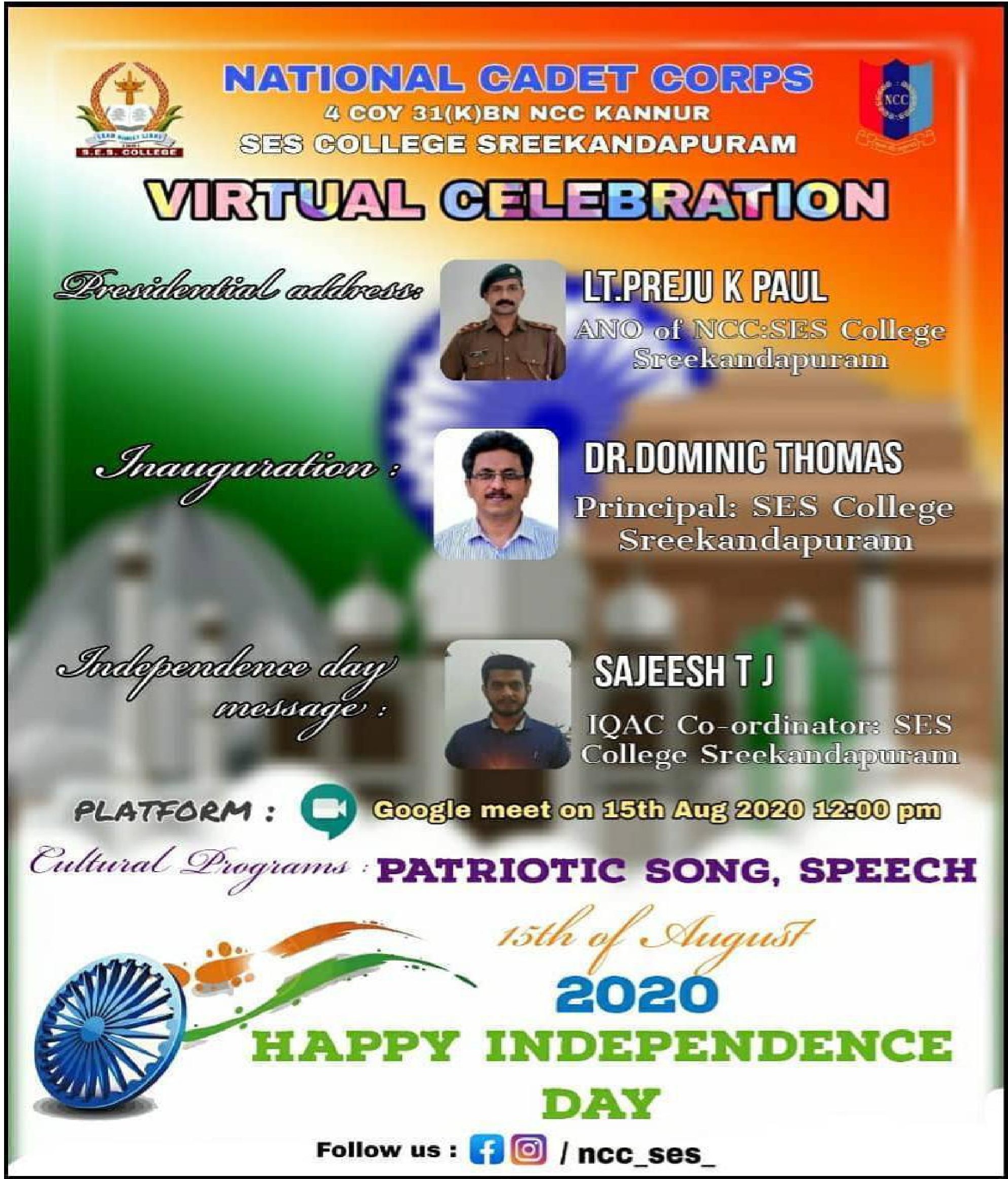 On August 15th 2020 NCC unit of s e s college celebrated the independence Day. As a part of independence Day celebration the unit conducted 3 programs.